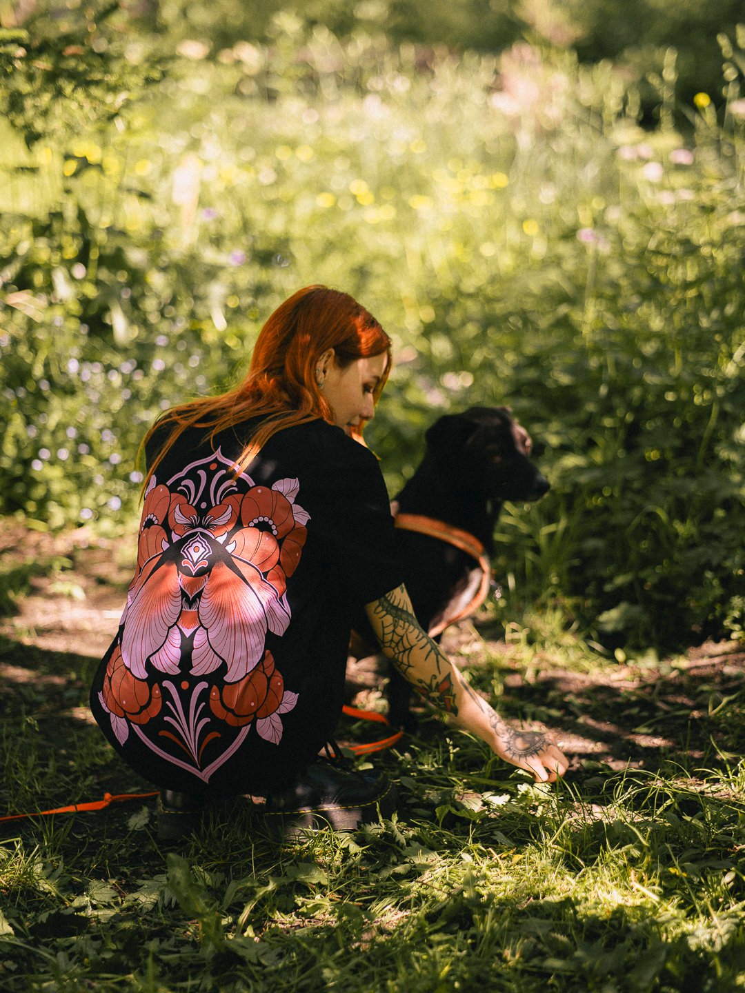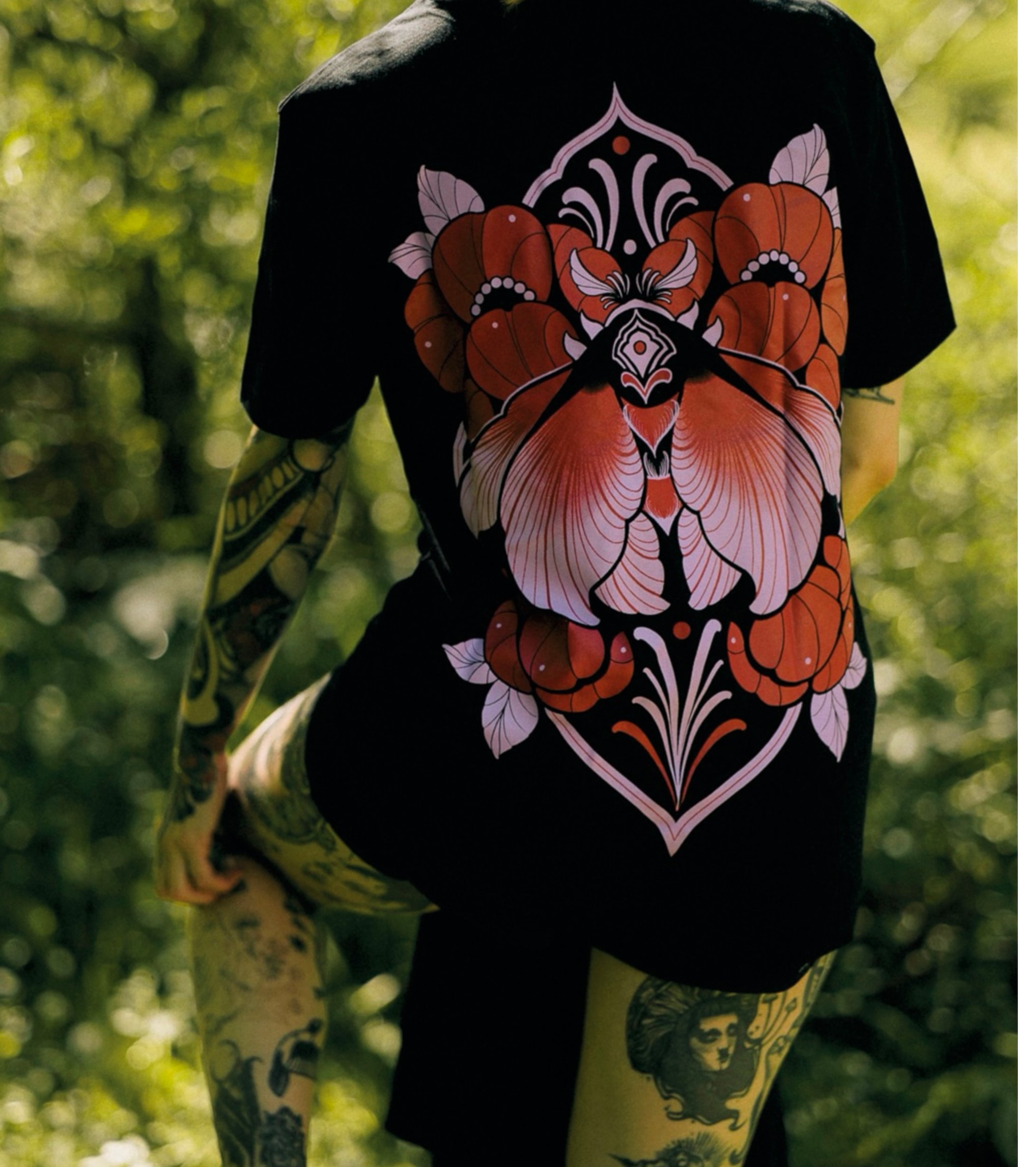 The bumblebee T-shirt has a beautiful hand printed on the front and the back. It is hand screen printed and the outer fabric is in single jersey, 100% organic cotton.